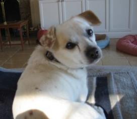 Tommy looks like he may be a Chihuahua/Jack Russell Terrier mix. He weighs 13 pounds and has the energy (and the jumping ability) of a much younger dog. He loves to play tug of war and we're working on taking treats with a gentle mouth and not jumping up. Tommy wants to please and loves to follow his foster mom everywhere. He used to sleep under the covers with his owner.